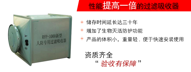 RFP系列過濾吸收器為本公司新研制的人防專用過濾吸收器,主要用于人防工程涉毒通風系統(tǒng),能有效過濾染毒空氣中的毒煙、毒霧、生物氣溶膠及放射性灰塵、持久性的過濾空氣使之清潔。人防工程安裝使用RFP-500型、RFP-1000型、RFP-300型人防專用過濾吸收器。